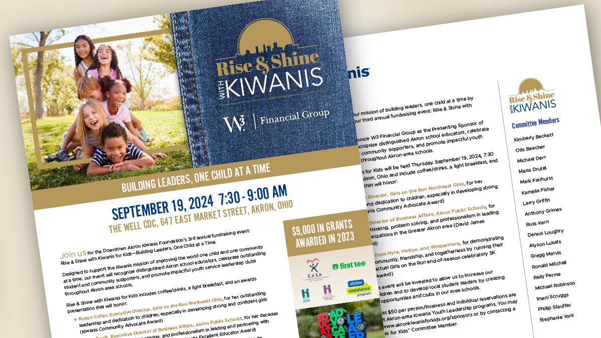 The Rise & Shine with Kiwanis for Kids event was created as a community-wide fundraising initiative to directly support Kiwanis’ mission of Building Leaders, One Child at a Time. Proceeds from the event fuel youth leadership programs across Akron Public Schools, empowering students to step into leadership roles, serve their peers, and shape a brighter future.